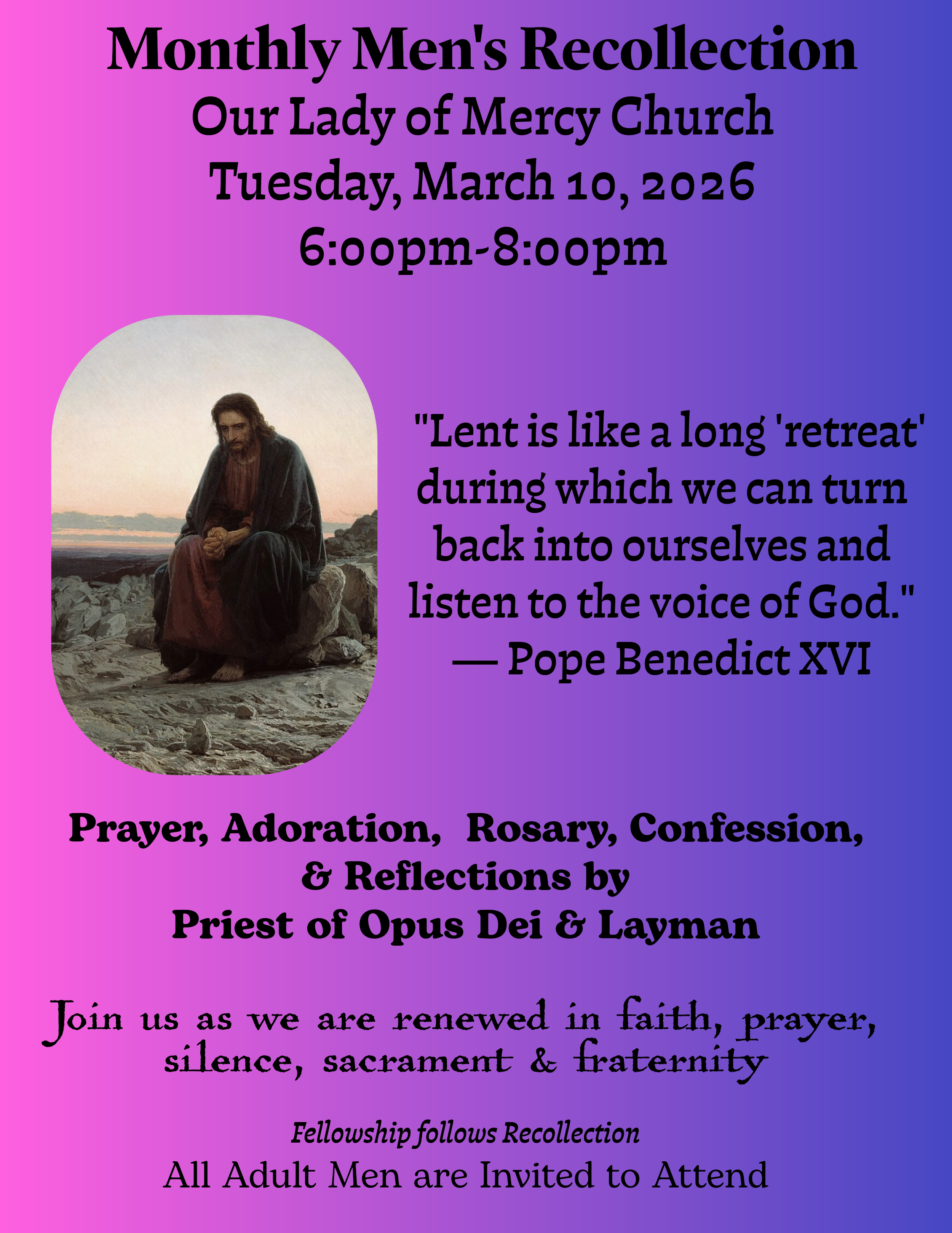 Monthly Men's Recollection Tuesday, March 10, 2026 6:00pm – 8:00pm 18:00 – 20:00 Our Lady of Mercy Catholic Church (map)