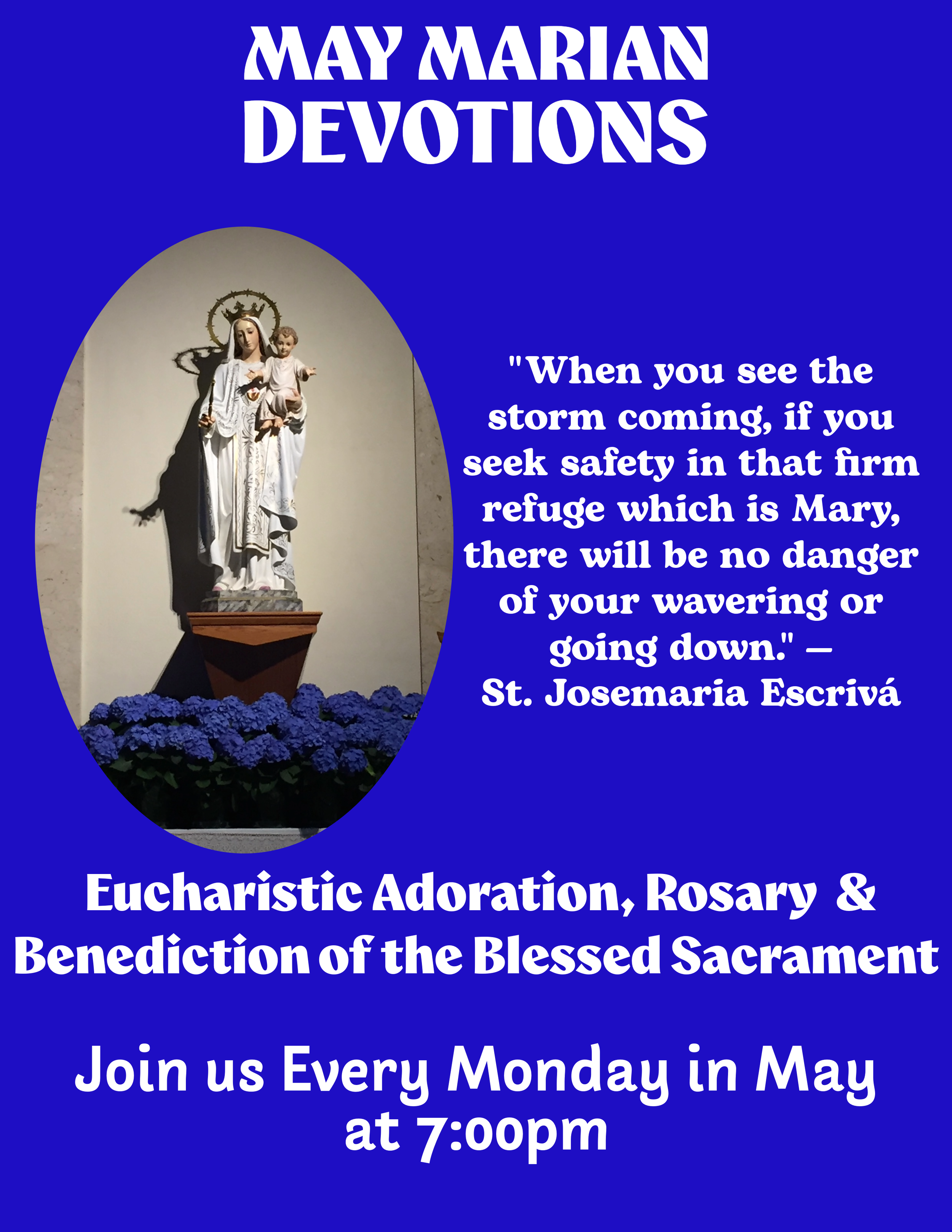 Marian Devotions on Mondays of May at 7:00pm Monday, May 4, 2026 – Monday, May 25, 2026 7:00pm 19:00 Our Lady of Mercy Catholic Church (map)