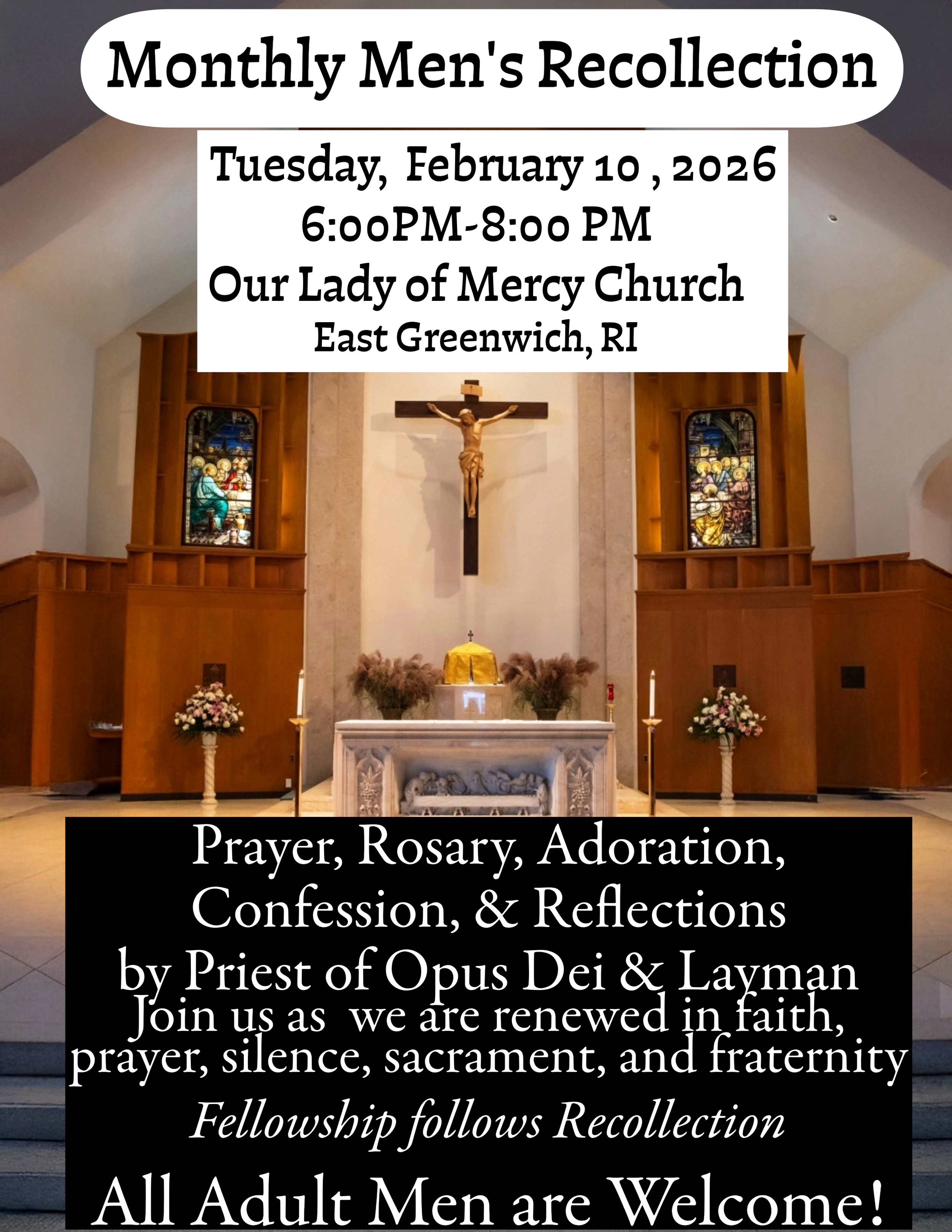 Monthly Men's Recollection Tuesday, February 10, 2026 6:00pm – 8:00pm 18:00 – 20:00 Our Lady of Mercy Catholic Church (map)
