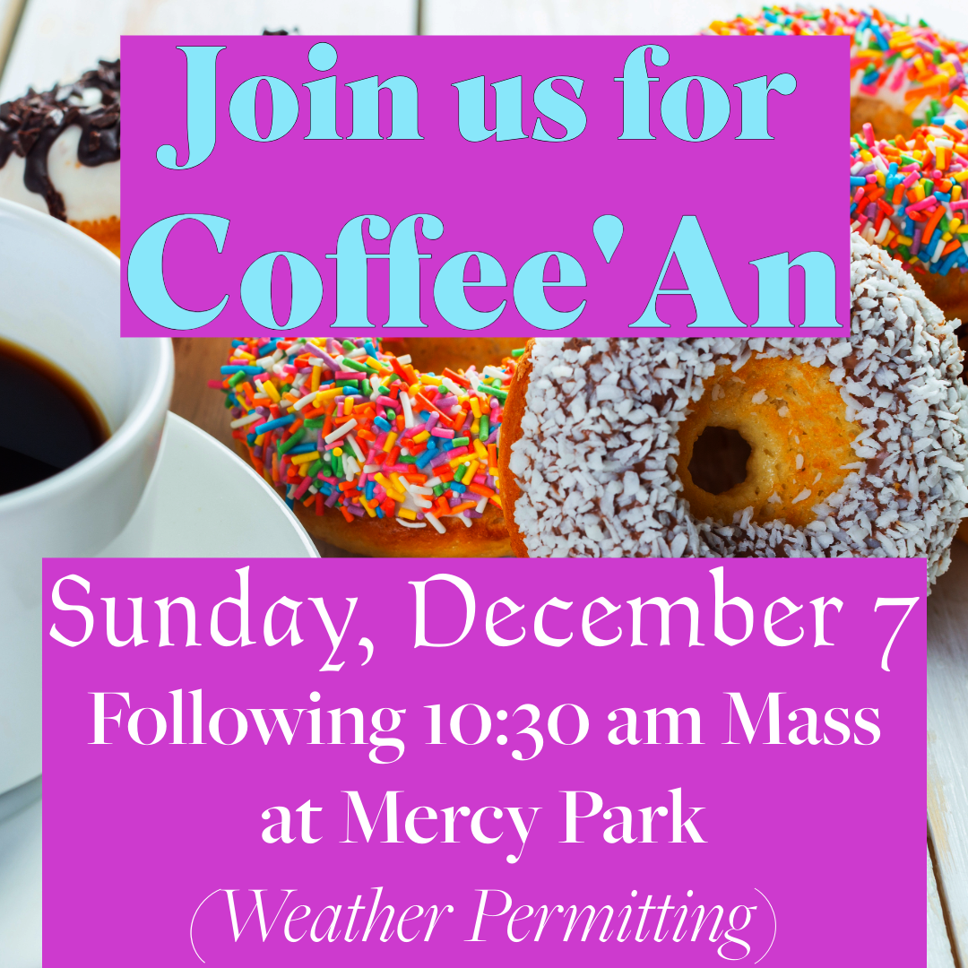 Monthly Coffe'an Sunday, December 7, 2025 11:30am – 12:30pm 11:30 – 12:30 Our Lady of Mercy Catholic Church (map)