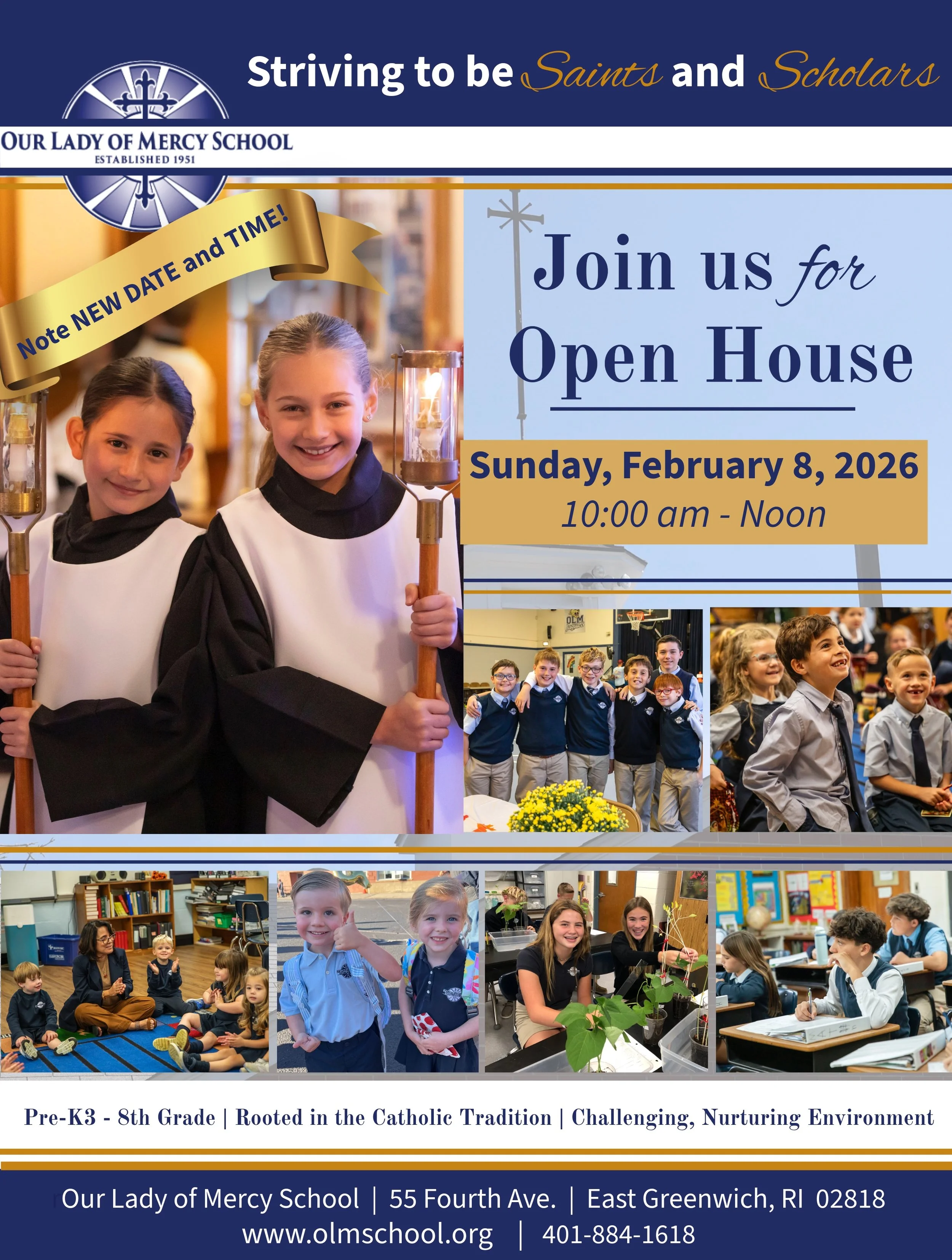 OLM School Open House Sunday, February 8, 2026 10:00am – 12:00pm 10:00 – 12:00 Our Lady of Mercy Catholic Church (map)